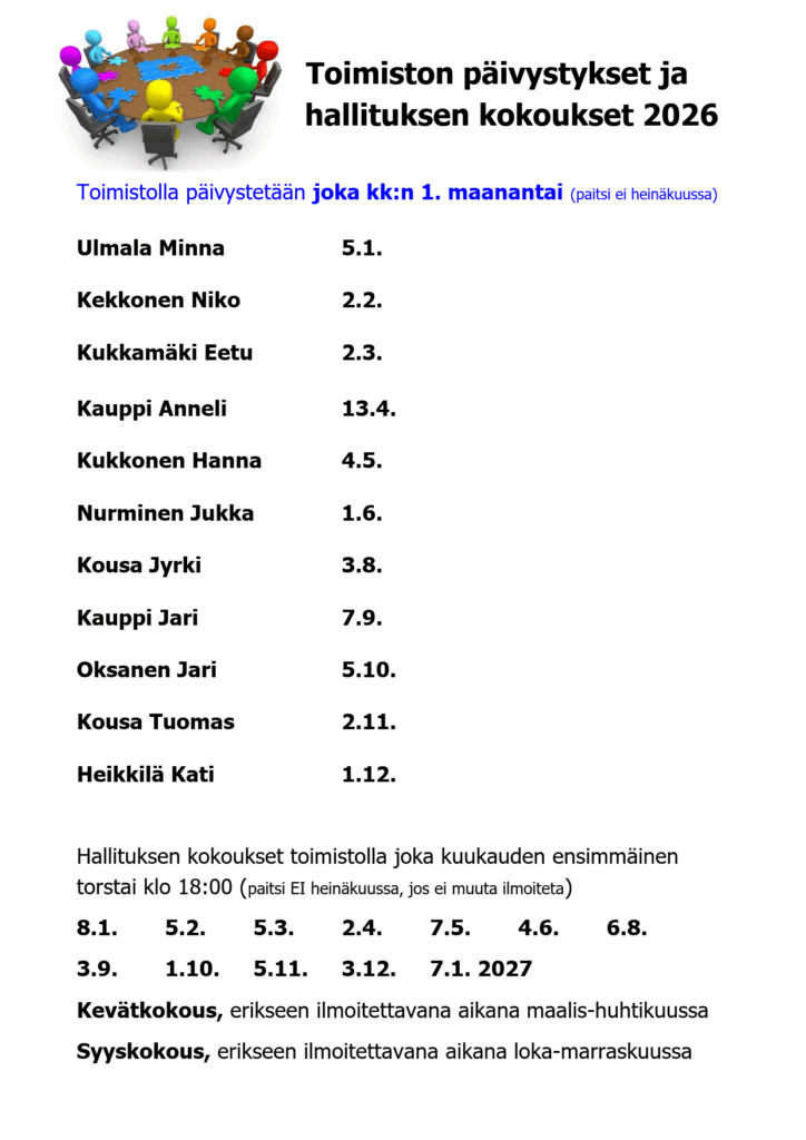 Seuran toimistolla Tekeväntie 3, 18300 Heinola on päivystys kuun ensimmäisenä maanantaina klo 18.00–19.00. Silloin siellä kannattaa käydä kuulostelemassa viimeiset kuulumiset. Toimiston päivystys on heinäkuun lomalla.